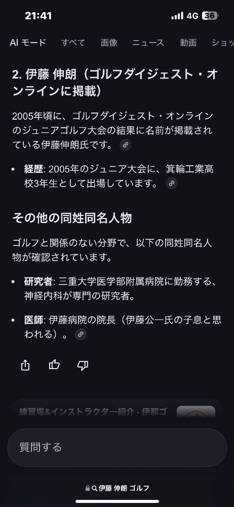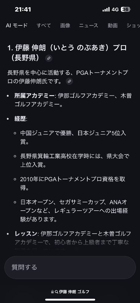 本日も沢山のご来場頂き誠にありがとうございました😊ふとAIで自分の名前を調べたら‥こんなのが出てきました笑写真をご覧下さい♪なんか凄い経歴笑自分はトーナメントプロではなくティーチングプロです笑けど学生時代はトーナメントプロを目指してました😊大変な道のりでしたよ💦何時も挫折してしまい一時期ゴルフを辞めていました💦親のおかげでまたゴルフの世界に戻って来れたので本当に親には感謝してます🥲AIで色々調べると面白いですよ笑明日のご来場心よりお待ちしております♪