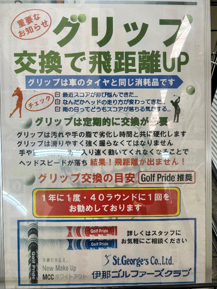 皆さんこんにちは😃グリップ交換は皆さん定期的に交換はしておりますでしょうか?つるつるなグリップだと握る力が強くなりクラブを早く振れません💦最低でも1年に1回は交換しましょう!伊那ゴルファーズクラブでもグリップ交換は出来ますので希望の方はフロントまで!グリップが新しくなると気持ちもよし!練習場に行こうとなりますよ😊